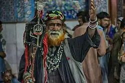 The lower orders prefer clothes dyed with indigo to white dresses[17] as latter show dirt too much, some people especially Fakirs, Dervishs and malangs wear green, black, red and orange color turbans. The black color is associated with Shah Abdul Latif Bhittai, Red color with Lal Shahbaz Qalandar, orange with Sachal Sarmast, and green with Shah Noorani, these all are Sufi saints of Sindh.