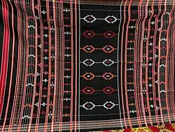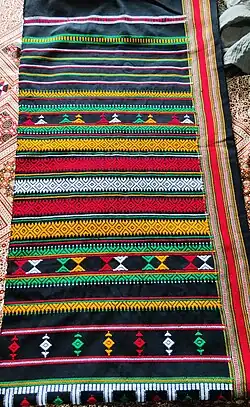Lungi/Lungee: made of silk, cotton and wool, in both bright and soft colours with beautifully woven broad borders of silver and gold thread. The use of bright, bold and vibrant colors with gold zari on the Lungi make its worth and significance, these are worn as shawl and as turbans on ceremonious occasions.[83][91]