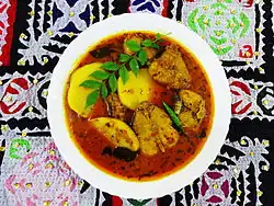 Sindhi cuisine (Sindhi: سنڌي کاڌا) refers to the distinct native cuisine of the Sindhi people from Sindh, Pakistan. Sindhi cuisine has been influenced by Central Asian, Iranian, Mughal food traditions.[1] It is mostly a non-vegetarian cuisine,[2] with even Sindhi Hindus widely accepting of meat consumption.[3] The daily food in most Sindhi households consists of wheat-based flat-bread (Mani) or rice accompanied by two dishes, one gravy and one dry with curd, papad or pickle. Freshwater fish and a wide variety of vegetables are usually used in Sindhi cuisine.[4] Restaurants specializing in Sindhi cuisine are rare, although it is found at truck stops in rural areas of Sindh province, and in a few restaurants in urban Sindh.[5]