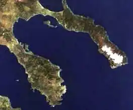![]() Satellite view of the Singitic Gulf, with the island of Ammouliani shown in the north | |