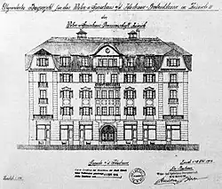 Despite vehement criticism and rejection, Lily Braun founded a Haushaltungsgenossenschaft GmbH in 1903 in order to realize her one-kitchen house idea. The architect Kurt Berndt designed a corresponding house for Olivaer Platz in Berlin-Wilmersdorf, in which "bright, airy, simple apartments of any size with bathrooms, gas cooking facilities, central heating, gas and electric lighting as well as passenger elevators in the equally equipped front and garden house" were planned around a central kitchen.[34] However, the project had to be abandoned as early as 1904 due to a lack of support and funding. At the time, none of the workers' organizations wanted to experiment with a public sector model and expose themselves to accusations of reformism.[23] Subsequently, it was the private sector that took up the idea and realized the first one-kitchen houses in Europe.