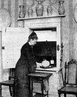 Käthe Schirmacher took an opposing position to Lischnewska in that she saw housework as socially necessary, productive professional work and demanded its economic, legal and social recognition and remuneration.[31] Elly Heuss-Knapp also rejected a "socialist solution" to the women's question and opposed the one-kitchen house solution, even though she welcomed technical progress and the improved infrastructure in the household. However, these would not be reflected in the reduction of housework, as the emotional and mental demands on the housewife would increase. However, such services could neither be provided by the market nor by cooperatives.[32] In this sense, the majority of BDF women rejected the one-kitchen house. More promising in the debate about the double work of women was an orientation towards the systematization of work in the individual household and its rationalization through technical innovations. Part of the women's movement focused primarily on organizing and training housewives.[33]