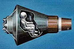A single-person spacecraft is a vehicle designed for space travel.[1] The concept has been used in science fiction and actual ships[1] such as the Mercury capsule, Vostok and some suborbital designs. Single-person spacecraft have been envisioned as a supplement or replacement for space suits in certain applications. The Von Braun Bottle suit of the 1950s functions as a hybrid of a space suit and a one-person spacecraft.[2][3]