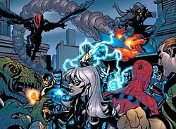 When the Savage Six attacks the world premiere of a film that Mary Jane Watson and a disguised Mysterio were involved in, the Sinister Six intervenes in order to get Mysterio in their ranks despite Spider-Man's intervention. Mysterio complies with Doctor Octopus and teleports Mary Jane away while Doctor Octopus knocks out Spider-Man.[45] Kindred kept the Savage Six on the reserve should the Foreigner's group, the Superior Foes, and the Sinister Syndicate fail to eliminate Spider-Man.[46] Badly wounded, Peter is relieved to find the Black Cat, Wolverine, and the Human Torch have arrived to help, unaware that they are Mysterio, the Lizard, and Electro in illusion disguises created by the former. The Lizard springs their trap too early by attacking Peter, much to Mysterio's annoyance. Peter fends off the Sinister Six until Doctor Octopus ensnares him with his tentacles. Peter attempts to appeal to Doctor Octopus' better nature, telling him that he is not like this anymore. Doctor Octopus briefly hesitates, but mounting pressure from the rest of the Sinister Six compels him to act, though this buys Peter enough time to break free. The Savage Six then attack the Sinister Six, giving Peter time to escape.[47] Ultimately, Doctor Octopus knocks all the other villains out using Black Ant's technology when he determines that Kindred planted some of his centipedes in the brains of every villain present, Octavius declaring that he dislikes being used even if he declines to help Peter further.[48]