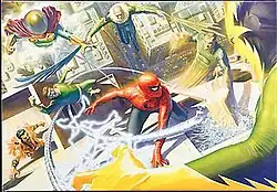 ![]() The original Sinister Six – Kraven the Hunter, Mysterio, Doctor Octopus, Vulture, Sandman, and Electro – battling Spider-Man. Art by Alex Ross. | |