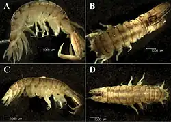 With distally pointed rostrum, triangular in dorsal view, the head of the species is longer than pereonite 1. The overall body is 12.2 mm (0.48 in) long. After preservation in alcohol the eyes are transparent, but the cephalic lobe is observed to be sharply produced. Shorter than pereonite no. 3, pereonite no. 1 and 2 is subequal in length. Urosomite no. 1 and 3 are separate.[1]
