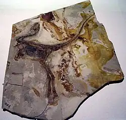 A pigmented area in the abdomen of the holotype has been suggested as possible traces of organs,[2] and was interpreted as the liver by John Ruben and colleagues, which they described as part of a crocodilian-like "hepatic piston" respiratory system.[6] A later study, while agreeing that the pigmented area represented something originally inside the body, found no defined structure and noted that any organs would have been distorted by the processes that flattened the skeleton into an essentially two-dimensional form.[3] Dark pigment is also present in the eye region of the holotype and another specimen.[2]