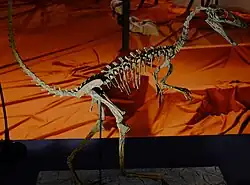 Three specimens have been assigned to Sinosauropteryx prima: the holotype GMV 2123 (and its counter slab [opposite face], NIGP 127586), NIGP 127587, and D 2141.[15] Another specimen, IVPP V14202, was originally assigned to the genus in 2010,[10] but was later designated as the holotype of a separate genus Huadanosaurus.[11] The assignment of an additional larger specimen to S. prima, GMV 2124 (also known as NGMC 2124), was later found to be in error,[15][16] and most likely belongs to Tyrannosauroidea.[11] All of the fossils were found in the Jianshangou or Dawangzhangzi Beds of the Yixian Formation in the Beipiao and Lingyuan regions of Liaoning, China. These fossil beds have been dated to 124.6–122 million years ago, during the early Aptian stage of the Early Cretaceous.[17]