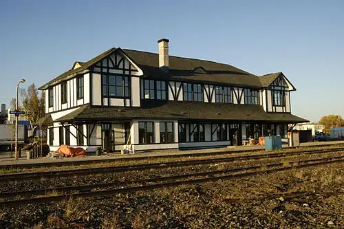 Sioux Lookout railway station is located in the town of Sioux Lookout, Kenora District in northwestern Ontario, Canada. The station is on the Canadian National Railway transcontinental main line; it is used by Via Rail and served by transcontinental Canadian trains. The station was opened in 1911 and remodelled in 1937; it was listed on the Canadian Register in 2008.[1] Via Rail uses a heated shack near the historic station building.