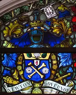 Coat of arms of Sir Alfred James Newton as Governor of the Irish Society in a memorial window of the Irish Society, erected at its tercentenary 1613–1913 in the Coleraine Town Hall.[11] Blazon: Azure, two shin-bones in saltire, the sinister surmounted of the dexter or, between as many roses in fesse argent, barbed and seeded proper, on a chief of the second a lotus-flower leaved and slipped of the last.[12]