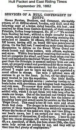 In 1865, Newton was a grain and seed broker in High Street, Hull.[2] In the 1870s he was a yeast merchant in Burton-on-Trent with his father.[3] Later he was in partnership with his brothers, William and George Beeforth Newton Jr., in a chandlery and shipping business called Newton Brothers of Burton on Trent and Hull. In 1874, they purchased a diving cutter and specialised in salvage, raising or breaking-up sunken ships that were a danger to navigation. This sometimes involved the use of explosives, and there was at least one fatality when a diver working for them drowned in 1875.[4] They expanded their fleet of ships, commissioning the 310 ft steamer Principia in 1881 for the India trade. In 1882 the British Government leased this ship, with others that they owned, to transport troops and materiel to the conflict in Egypt. This same year the partners opened a head office in the City of London at 19 Billiter Street.