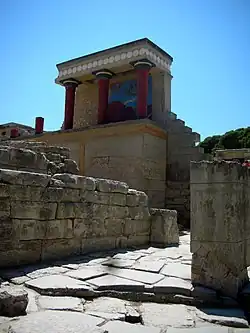 A portion of Evans's reconstruction of the Minoan palace at Knossos. This is Bastion A at the North Entrance, noted for the Bull Fresco above it.