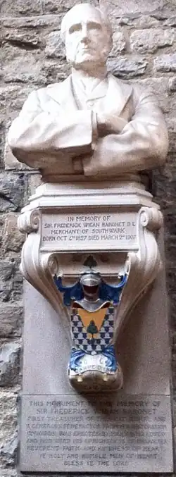 Wigan became a member of the St Saviour's Collegiate Church restoration committee 1890, which oversaw the rebuilding of the nave by the architect, Arthur Blomfield.[13] He donated two carved oak screens, designed by Blomfield,[14] as well as two windows by Charles Eamer Kempe to the church.[15] In 1905, the building became Southwark Cathedral and Wigan was appointed Treasurer of the chapter.[3] The year after his death, a sculpted bust was installed in the south transept.[16] A chalice and paten were presented to the cathedral in Wigan's memory by his niece in 1910.[17]