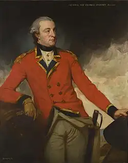 During the American Revolutionary War he was captain of the grenadier company of the Guards Brigade with the rank of lieutenant colonel in the army. In addition to his other duties, he filled the post of Mustermaster-General and Inspector of the Foreign Troops.[7] The latter responsibility required him to keep track of the strength and condition of the Hessian and other German mercenaries. The information was sent to Lord George Germain, the Secretary of State for America.[8] For the American war, the British military establishment assembled the 1,000-man Guards Brigade by choosing the men by lottery from the 1st Foot Guards, 2nd, and 3rd Foot Guards. Brigadier General Edward Mathew commanded the unit which was split into two battalions of 500 troops each. Unlike the other regiments of foot, the light and grenadier companies of the Guards fought with their parent unit rather than being converged into elite battalions. Colonel Charles O'Hara, who later held important commands in the British army, belonged to the Guards Brigade.[9] Among his friends, Osborn counted Lieutenant Colonel William Harcourt of the 16th Light Dragoons,[10] Captain-lieutenant Richard FitzPatrick of the 1st Foot Guards,[6] Lieutenant Colonel Sir John Wrottesley of the 2nd Foot Guards,[11] and Colonel Henry Monckton of the 2nd Grenadier Battalion.[12]