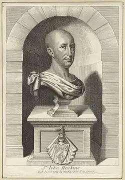 Hoskyns was elected President of the Royal Society in 1682, in succession to his friend Sir Christopher Wren. His friends included Francis North, 1st Baron Guilford, John Evelyn, and John Aubrey. Sir John was elected to parliament called on the death of Charles II for Herefordshire. He resigned the chair the following year, but from 1685 to 1687 was secretary. He died on 12 September 1705, and was buried at Harewood, Herefordshire.[1]