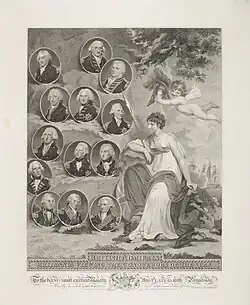 British Admirals - Brittania Viewing the Conquerors of the Seas - Roberts, 1800 - Admiral Kingsmill shown top left