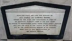 Hood was about to retire and return to England. Rear-Admiral Sir George Burlton had been appointed to succeed him, but before the exchange could take place Hood died at Madras on 24 December 1814 after a three-day fever following a visit to Tippoo Sahib's former palace at Srirangapatna.[13] "In him it may truly be said, that the British nation lost one of its most experienced and gallant defenders, a long-tried friend and companion of the Immortal Nelson."[20] He was buried at St. Mary's Church, Madras, where survives his mural monument. The heir to his baronetcy, under special remainder, was his nephew Sir Alexander Hood, 2nd Baronet (1793–1851), son of his elder brother Captain Alexander Hood (1758–1798) by his wife Elizabeth Periam, daughter and sole heiress of John Periam (1714–1788) of Wootton House[21][22][23] (alias "Butleigh Wootton") in the parish of Butleigh, Somerset.