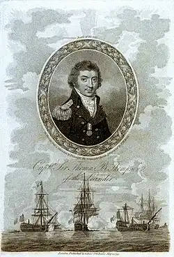 He spent a number of years on land without command of a ship until the outbreak of the French Revolutionary Wars provided employment. By late 1796 he had secured command of the fourth rate HMS Leander. He then joined the Mediterranean Fleet under John Jervis, and was assigned to the squadron under Horatio Nelson.[1] Thompson took part in Nelson's attack on Santa Cruz in July 1797. Thompson was among those leading the landing parties, under the overall direction of Nelson and Thomas Troubridge. The initial attempts to force a landing were hampered by the wind, and when the parties made a successful landing in the evening of 22 July, they came under heavy fire from the Spanish defenders. Thompson's party were able to advance and spike several of the enemy's cannon, but the British forces had become dispersed throughout the town, and were forced to negotiate a truce to allow them to withdraw. Thompson himself was wounded in the battle.[1]