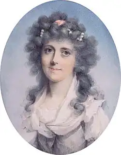 Garrow had an irregular relationship with Sarah Dore, who had previously borne a son, William Arthur Dore Hill, by Arthur Hill, Viscount Fairford in 1778.[44] Thomas Hague has suggested that Dore was an Irish noblewoman Garrow had seduced, but the only intent of his writings was to disparage Garrow, and there is no evidence to support his claim.[45] Their first child, David William Garrow, was born on 15 April 1781, and their second, Eliza Sophia Garrow, was born on 18 June 1784. Garrow and Dore finally married on 17 March 1793.[46] Sarah was noted as particularly elegant, and was actively involved in local matters in Ramsgate, where the family lived.[47] She died on 30 June 1808 after a long illness,[48] and was buried at the Church of St Margaret, Darenth.[49] David William Garrow was educated at Christ Church, Oxford, earning the degree of Doctor of Divinity, and served as one of the Chaplains to the Prince of Wales.[50] His son, Edward Garrow, was a cricketer and clergyman.[51] Eliza Sophia Garrow married Samuel Fothergill Lettsom; one of her children, also named William Garrow, served as the Consul-General of Uruguay.[52]