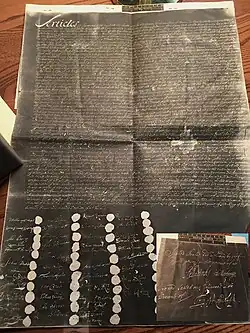 Around this same time, the thirty-two-year-old Phips had made his way to England, where he gained an audience with Narborough and Charles II. By any measure, this was a remarkable achievement for a poor New Englander like Phips, but it also seems clear that he must have been at the right place at the right time. His reputation for finding sunken ships may have preceded him, and he seems to have had demonstrable gains to show, as one letter writer mentions his "late successful returns." He possibly delivered the King's portion of these returns to Whitehall in person.[19] A plan was concocted, probably by Narborough, whereby Phips would be assigned as the commander of a 20-gun frigate, HMS Rose of Algiers, for a treasure hunt but given no other financial backing. He and his crew would be required to pay for all other expenses of the voyage, including food and diving equipment, and give a deposit of £100. Of the treasure they found, 35% would go to the King, and the rest would be divided among the otherwise unpaid crew. On July 13, 1683, the articles of agreement (see image) were signed by Phips and seven other crew members, in the presence of Narborough and Haddock.[20]