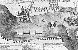 Because of contrary winds and the difficulty in navigating the Saint Lawrence, the expedition took eight weeks to reach Quebec.[65] The late arrival (wintry conditions were already setting in on the river) and the long voyage meant that it would be impossible to conduct a lengthy siege. Phips sent a message into the citadel demanding its surrender. Governor General Louis de Buade de Frontenac declared that his only response would be from "the mouths of my cannons".[64] Phips then held a war council, which decided to make a combined land assault and naval bombardment.[65] Both failed. The landing force, 1,200 men led by Major John Walley, were unable to cross the well-defended Saint-Charles River, and the naval bombardment failed because the New Englanders' guns were unable to reach the high battlements of the city, and they furthermore soon ran out of ammunition. The fighting, according to Phips, cost the expedition 30 deaths and one field cannon, as well as numerous wounded; disease and disaster took an additional toll. Smallpox ravaged the troops, and two transports were lost to accidents; another 200 men were lost to these causes.[66]