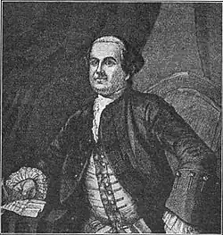 Phips was born the son of James and Mary Phips in a frontier settlement at Nequasset (present-day Woolwich, Maine), near the mouth of the Kennebec River,[1] on February 2, 1651.[2] His father died when the boy was six years old, and his mother married a neighbor and business partner, John White.[1] Although Cotton Mather in his biography of Phips claimed that he was one of 26 children, this number is likely an exaggeration or includes many who did not survive infancy. His mother is known to have had six children by James Phips and eight by White.[3] His father was poor, but his ancestry may have descended from country gentry in Nottinghamshire, at least technically. Constantine Phipps, Lord Chancellor of Ireland, seems to have been a cousin of Phips, five years his junior.[4]