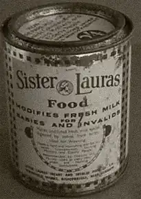 In the early 1900s Sister Laura Marian Smith, a pediatric dispensary nurse at the Glasgow Royal Maternity Hospital, noted the high levels of malnutrition in children at the time. She promoted the use of a casein inhibitor to make cow's milk more beneficial to those who had extreme difficulty in digesting it. A powder formula to mix with milk became an effective and low-cost aid to patient recovery.[1] Although the product was named after Sister Laura, the commercial powder is said to have been developed by Leonard Findlay, at the time a noted expert of infant dietary disorders at Rottenrow. Sister Laura was one of the original shareholders when the company when it was established in 1911. However, by 1920 she had sold her interests in the company, to avoid the appearance of a profit motive in her work or the work of the dispensary.[2]