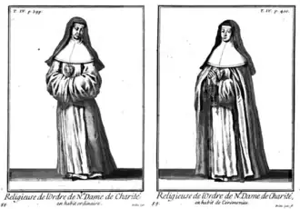 The order originated with the priest John Eudes, who attempted to find homes for prostitutes under the care of Catholic women. One of these women, Madeleine Lamy persuaded Eudes that more was needed. Three Visitation nuns came to his aid temporarily, and, in 1641, a house was opened at Caen under the title of Refuge of Our Lady of Charity.[2] Other women joined them, and, in 1651, the Bishop of Bayeux gave the institute his approbation. In 1664 a bull of approbation was obtained from Pope Alexander VII. That same year a house was opened at Rennes, and the institute began to spread. When the French Revolution broke out there were seven communities of the order in France.[3]