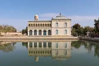 The Sitorai Mohi Khosa Palace is divided into the old and the new. The initial constructions of the palace (which have not survived to this day) date back to the 18th century, and then, during the reign of Emir Said Abd al-Ahad Khan in the second half of the 19th century, further buildings were added.[4][5][6][7] The new complex was built in a European style but is divided into a male and a female section, with an Eastern interior design.[6] It was constructed during the rule of the last Emir of Bukhara, Sayyid Mir Muhammad Alim Khan (1912–1920).[8][5][6][7][9][10] The construction of the palace involved famous master craftsmen of their time, such as Hasanjon Umarov, Abdullo Gafurov, Rahim Khaitov, Ibrahim Khafizov, Karim Samadov, Usto Zhura, Usto Khodjakul, and Usta Shirin Murodov, as well as two Russian engineers, Margulis and Sakovich, who served at the emir's court. Currently, the palace houses a museum of decorative and applied arts.[5]
