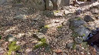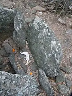 The southeast face of the dolmen features an original opening system: three small vertical slabs set into the ground and a fourth, more enormous slab that could be moved over the others like a door. This system was intended to allow new corpses to be placed in the burial site. The removable slab is 1.35 m long, 0.85 m wide and 0.25 m thick.[18] Dolmens found with their closing slab are very rare. A dolmen fitted with a system like this (a removable slab and access at mid-height) is called a "porte-fenêtre dolmen"[19] or "Pyrenean chamber".[20] The dimensions of the vertical slabs are given in the table below.