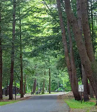 Sizerville State Park is named after the nearby ghost town of Sizerville, Pennsylvania, which was in turn named for the Sizer family, early settlers of the region. With the end of the logging boom of the late 19th century, the town was gradually abandoned. Sizerville State Park was first opened in 1924. The first park facilities were opened in 1927. The Civilian Conservation Corps led an effort to reforest the lands surrounding Sizerville State park during the Great Depression of the 1930s. Thousands of acres of old growth timber had been logged at the turn of the 20th century. The CCC planted thousands of acres of white pine and hemlock trees. Today these trees have reached maturity and make up most of the forested acres of Sizerville State Park.[3]
