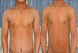 | Two brothers (21 and 25 years old) with generalized dryness of skin with fine scales mainly around the umbilicus and in the flexural folds, one of Sjögren–Larsson syndrome's characteristics | |
