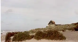 Still in a state of flux, the peninsula was formed some 15,000 years ago when the ice melted around Vendsyssel creating a coastline stretching south to Frederikshavn. It was formed by sedimentary materials drifting from Jutland's west coast.[10] The northernmost point is located on Skagen Nordstrand, where currents bring sand to the Skagens Rev reef, causing it to grow (20–25 ft (6.1–7.6 m)) in an easterly direction every year while the western side is slowly eroded. This explains why the summer houses built on the coast around 1900 are now some 500 m (1,600 ft) from the beach.[11] The sand spit is reported to be extending at the rate 4 m (13 ft) per year.[2] The spit's evolution has been "influenced by isostatic uplift (causing a drop in relative sea level) and eustatic sea level change."[6]