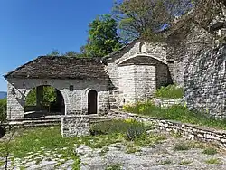 The monastery of St Paraskevi (Agia Paraskevi) dates from the 12th or 13th century, as some of the oldest murals suggest, during the period of the Despotate of Epirus. It was founded as a nunnery with 60 nuns. On the record of its last commissioner, it became a Stauropegic monastery in 1453 after the Fall of Constantinople - that is it came under the direct jurisdiction of the Ecumenical Patriarchate of Constantinople - and has remained so ever since. It was refounded in 1697 as a male monastery. Some of the frescoes were painted in 1717 and 1773 by painters from nearby Kapesovo and from Chionades. The exterior fresco mainly around the theme of the Final Judgement was apparently made by a hagiographer from nearby Koukouli. The frail frescoes were restored in 1933 and 1984. The monastery became ruinous and only the central church remains out of the original foundation. Another old church, that of the Panagia (church of the Hyperagia Theotokos or the Dormition of the Theotokos) has suffered from disrepair and, although still standing, had been for decades closed to the public. It has been now repaired and has been re-opened for services. It is believed to have been founded in the 8th C.