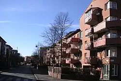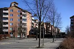 The characteristical orange-red brick buildings of Skarpnäcksfältet have received international attention, partially because the relatively large area consists of exclusively such buildings.[14] Other than the apartment buildings, a number of row-houses and an industrial area were built around the same time, painted in similar colours to fit with the rest of Skarpnäcksfältet.[14] The design, by architect Leif Blomquist, has received several awards for its extraordinarity.[14] Skarpnäcksfältet has considerably few connections with other districts, giving it the image of a slightly isolated area, and some argue that a road to Bagarmossen with new housing developments would lead to a better integration of Skarpnäcksfältet, while others think that the nature between the two areas should be preserved.[3]