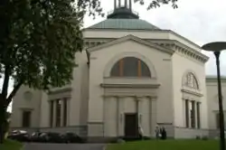 Named after its location, the church was built 1823-1849 to replace a minor wooden church on Blasieholmen destroyed in the devastating fire of 1822. Inaugurated by King Charles XIV John on 24 July 1842 and still officially carrying his name,[2] it was designed by the architect Fredrik Blom as a neoclassical octahedral temple inspired by the Pantheon in Rome, borrowing the coffered ceiling while substituting the oculus for the temple-shaped lantern light. On all sides, the plain white walls restored in 1998 are pierced by portals whose four pillars support semi-circular lunettes. Inside the cruciform exterior, the interior sheet of the wooden double cupola is supported by paired doric columns and rounded arches. Accompanying the painted altarpiece are niches with statues of the apostles and two plaster groups.