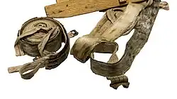 Climbing skins are strips that attach to the bottom of Nordic, alpine touring or randonnée skis to help while ascending backcountry slopes. They are designed to be removed for skiing downhill. They are typically attached to the skis via a loop on the ski tip, a hook on the tail, and adhesive on the base of the skin. They are called skins because they resemble sealskin, from which the first ski skins were made.[1] They are typically made from nylon or mohair or a combination thereof, and are designed to let the ski slide forward on snow but not backward.[2][3] They are usually narrower than the ski to allow the ski edges to get a grip. Some ski resorts permit skinning.[4][5]