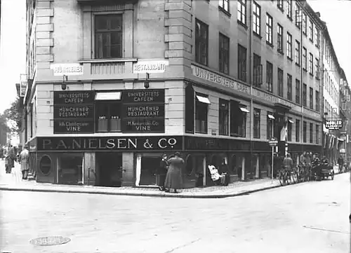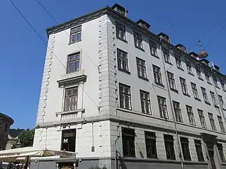 In 1855, five years prior to her death, Ingeborg Blom sold the property to restaurateur Christian Jørgensen. He opened a café and billiard parlour on the ground floor. His property was home to a total of 53 residents at the time of the 1860 census.[25] Christian Jørgensen occupied the first floor and one half of the ground floor. He lived there with his wife Anna Christine Jørgensen (née Reuther), two of their children (aged 19 and 29), four servants and the lodger Ludvig Alexander Rømeling Stricker.[26] Simeon Nathan Kalkar, a merchant, resided in the other ground-floor apartment with his wife Emma Kalkar (née Libeschutz), their two children (aged one and two), one maid and one lodger.[27] Ludvig Wilhelm Petersen, a bookkeeper, resided in the other first-floor apartment with his wife Dorthea Sophie Petersen (née Bruhn), their daughter Catharine Sophie Cecilie Petersen, his sister-in-law Chatarine Bruhn and one maid.[28] The lawyer Lars Christian Larsen now occupied the entire second floor. He lived there with their wife, now their four sons (aged three to 13), his wife's niece Anna Sophie Helweg, 40-year-old Marie Frederikke Toxverd and three maids.[29] The eldest son was the later lawyer H.F. Helweg-Larsen. Two of his younger brothers were the later military officer and writer Axel Liljefalk and the later clergy Vilhelm Helweg-Larsen. A fifth son, Christian Helweg-Larsen, born in October of the same year, would later serve as the last Governor-General of the Danish West Indies. Carl Albecht Cold (1824-1876), a judge at the Criminal Court, resided on the third floor to the right with his wife Apellonia Cold (née Foss), one maid and one male servant.[30] Four women employed with needlework resided in the garret.[31][32][33] Markus Jens Ludvig Lange, a garmer, resided on the third floor to the left with a housekeeper and a maid.[34] Christian Hedegaard, a junk dealer, resided in the basement with his wife Charlotte Frederikke (née Poulsen) and their three children (aged 18 to 21).[35] Christian Joseph Empacher, a master shoemaker, resided in the other half of the basement with his wife Enna Julie Albertine Empacher, their three children (aged eight to 11), one shoemaker (employee) and one maid.[36]