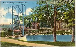 Among the town's features is the Swinging Bridge, a suspension footbridge first constructed in 1883 to connect Skowhegan Island with the south side of the Kennebec River. The swinging bridge was originally built for a local farmer to make his distance onto the island shorter for him to have to walk. This bridge lasted six years, until in 1888 the cables rotted and the bridge collapsed. A new bridge was built, which lasted until 1901, when a flood washed it out. Another bridge was built, higher this time, but in 1936, that bridge was washed out by a flood as well. It was rebuilt and has been in use since then. The Swinging Bridge was renovated in 2006 by the Skowhegan Highway Department, which earned the department a 2007 American Public Works Association Public Works Excellence Award.[29] A railroad bridge was converted to a footbridge across the Kennebec River. This bridge was damaged in the Maine Flood of 1987.[30]
