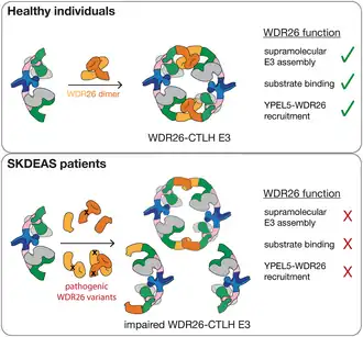 - ^ a b Gross, Annette; et al. (2024-04-04). Griesinger, Christian (ed.). "Skraban–Deardorff intellectual disability syndrome-associated mutations in WDR26 impair CTLH E3 complex assembly". FEBS Letters. 598 (9). Cambridge, England: Federation of European Biochemical Societies: 978–994. doi:10.1002/1873-3468.14866. ISSN 1873-3468. PMC 7616460. PMID 38575527.