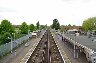 Slade Green railway station is in the London Borough of Bexley, southeast London, on the North Kent Line. It is 15 miles 30 chains (24.7 km) measured from London Charing Cross.