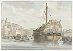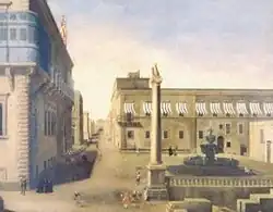 Slaves in Malta were viewed as saleable objects, and were referred to as merchandise in the penal code of 1724.[8] They were auctioned off at a public slave market in Valletta, which was situated at Piazza San Giorgio, the city's main square in front of the Grandmaster's Palace.[16] At the time, similar markets also existed in Christian Mediterranean ports such as Genoa, Messina, Livorno and Naples.[17] Slaves were also traded abroad or could be given as gifts; for example several female slaves were gifted by the Hospitallers to the vice-reine of Naples between 1637 and 1655. The English Royal Navy considered purchasing slaves from Malta for its Mediterranean Fleet in the 17th century,[8] while the Papal Navy regularly bought Muslim slaves from anyone who could provide them, including from the Hospitallers.[17] 100 slaves were sent to the Pope in 1662 for service in his navy, while 40 others were presented to the Pope in 1720 after the Ottoman sultan requested the Papacy to send Muslim slaves to repair the Church of the Holy Sepulchre in Jerusalem.[8]