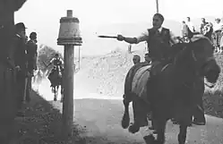 Slovene quintain[1][2][3] (Slovene: štehvanje, German: Kufenstechen) is a traditional Slovene mounted folk game, a form of jousting, that has been preserved in the southern Austrian state of Carinthia. It is held during Kirchweih festivals in the lower Gail Valley, where it has become a major tourist attraction. The štehvanje competition has also taken place every year in Savlje, Ljubljana and sometimes in neighboring villages since the 1930s.