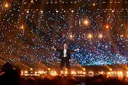 Klemen took part in technical rehearsals on 3 and 7 May, followed by dress rehearsals on 12 and 13 May.[38] On 2 May 2025, he revealed that the performance would include a stunt of himself being suspended upside-down, retaining the climax of the national final. Klemen was joined on stage by his wife, Mojca Fatur, and dancers Miha Furlan and Matic Zadravec.[39] The director for the performance was Nejc Levstik, the lighting was directed by Črt Birsa, the content designer for the LED screens was Žiga Radulj, the technical execution of the acrobatics was led by Filip Kržišnik, the choreographer was Erik Bukovnik, and the costume designer was Vesna Mirtelj.[40][41]
