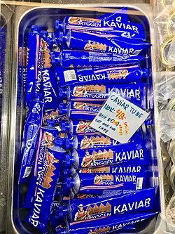 Smörgåskaviar ('sandwich caviar') is the Swedish word for a fish roe spread eaten in the Nordic countries and released in the 1950s.[1][2] Despite its name, smörgåskaviar is not actual caviar, i.e. sturgeon roe. Instead, it is a paste made most often from cod roe and a variable mix of other ingredients. Whole roe is aged for up to two years in barrels in which the roe is layered with sugar, salt, and a sugar-salt brine, and turned regularly. After brining, it is smoked and then processed further. It is emulsified with oil such as rapeseed, soybean or cod oil. Other ingredients are added including potato flakes, tomato sauce, vinegar, onion, sugar, salt and sometimes dill or chives. The final paste contains 30–60% roe. It is sold in tubes in smoked and non-smoked variants.[2][3]