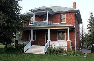 The Smeltzer House is reflective of many homes built by farmers of modest wealth across the Canadian Prairies. The two-story structure was built in the economical and utilitarian American Foursquare architectural style, complete with a red brick exterior and tinted mortar, symmetrical façade, hipped-roof, two corbelled chimneys, and open front verandah.[2] The home also includes some elements of the Georgian Revival style, including decorative dentils under the eaves and columns that support the front verandah.[4]