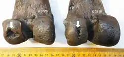 103. ^ Schmökel, Hugo; Farrell, Aisling; Balisi, Mairin F. (2023). "Subchondral defects resembling osteochondrosis dissecans in joint surfaces of the extinct saber-toothed cat Smilodon fatalis and dire wolf Aenocyon dirus". PLOS ONE. 18 (7): e0287656. Bibcode:2023PLoSO..1887656S. doi:10.1371/journal.pone.0287656. PMC 10337945. PMID 37436967.