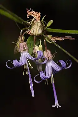 The nodding flowers are blue-purple and appear on a panicle in groups of 3–5. The pedicel is variable in length, between 6–20 mm. The sepals are spreading to reflexed and the calyx is fused into an obconic tube covering less than half the length of the corolla. The corolla, fused at the base, is divided into 5 slender petals that are distinctly recurved at their tips. The stamens are 6 mm long with ciliate base. The ovary is 2.5–5 mm in diameter and hemispheric. The style, 15–18 mm long, is noticeably exserted beyond the sepals and petals and may be slightly curved. It is likewise blue and the distal half is papillate. The stigma is clavate and has 3 short curved divisions.[4][5][2]