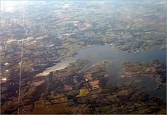 ![]() Lower portion of the lake from the east. The dam is just above the center. | |
