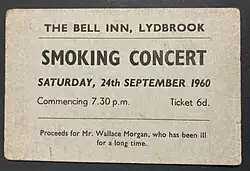 Smoking concerts were live performances, usually of music, before an audience of men only, popular during the Victorian era. These social occasions were instrumental in introducing new musical forms to the public. At these functions men would smoke and speak of politics while listening to live music. These popular gatherings were sometimes held at hotels.